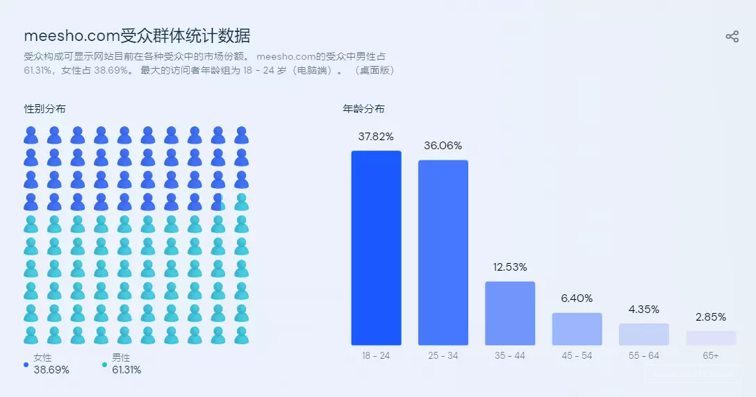 meesho.com的受众中,男性占61.31%,女性占38.69%。网站最大的访问群组是年龄在18-324岁的人(PC端)。