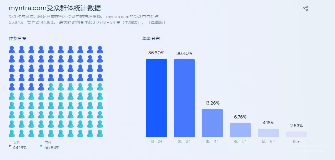 myntra.com的受众中,男性占55.84%,女性占44.16%。网站最大的访问群体是年龄在18-24岁的人(PC端)。