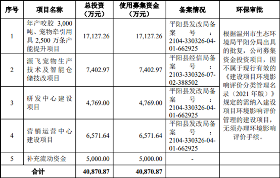 据悉,源飞宠物拟使用本次募集资金投资额为4.1亿元,拟投入"年产咬胶3000吨、宠物牵引用具2500万条产能提升"、"源飞宠物生产技术及智能仓储技改"、"研发中心建设"、"营销运营中心建设"及"补充流动资金"等五个项目建设。