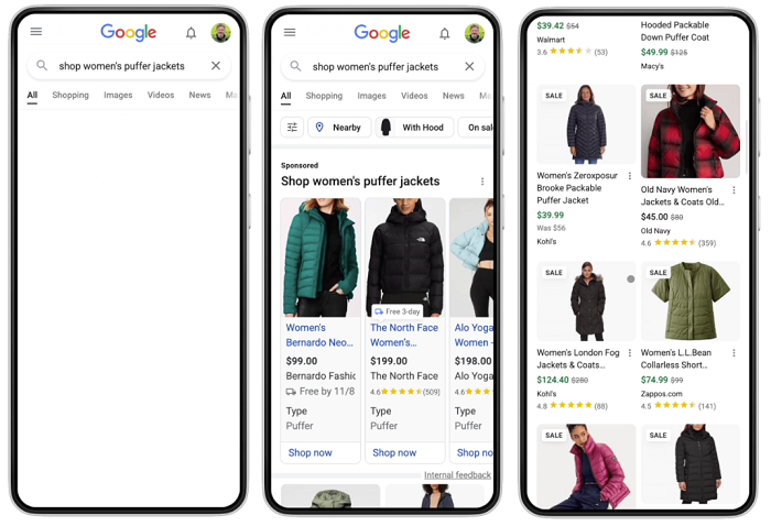 谷歌还在相关产品搜索中为所有列出的项目添加了一个新的并排比较显示。例如,搜索女士羽绒服外套,我们将在搜索结果中并排显示适配的羽绒服商品比较。这个新玩法将于本月在美国推出,并且此显示不在"购物"标签中,而是在该产品的主要Google搜索结果列表中。