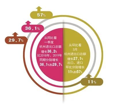 从同比看,杭州一季度外贸增长36.2%。如果跟2018年、2019年同期相比,则分别增长36.1%和29.7%。