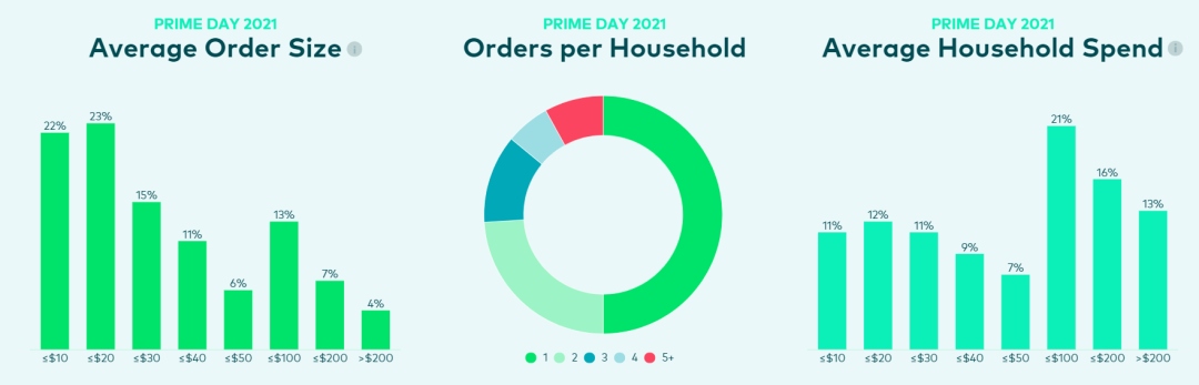 数据显示,年收入超过10亿美元的大卖家在周一公布的销售额与去年同期相比增长了28%,而年收入低于1000万美元的中小型卖家的销售额也增长了 22%。在Prime Day购物的家庭中,有一半下了 2个以上的订单,家庭平均支出约为96.32 美元。