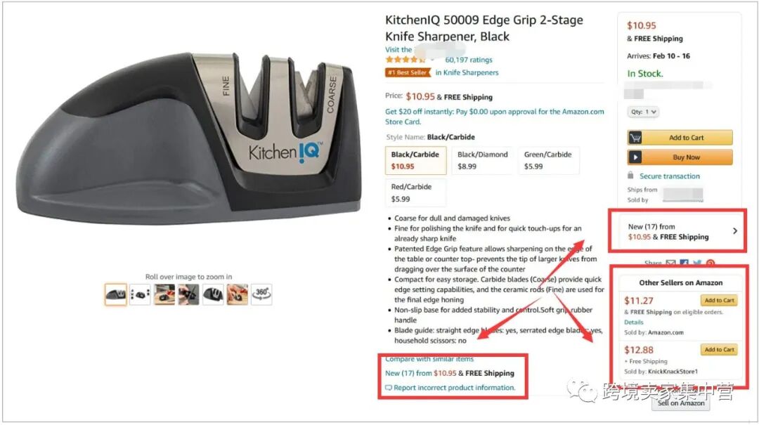 在这款产品的listing界面,红色的三个小方框中,都可以看到跟卖的身影。