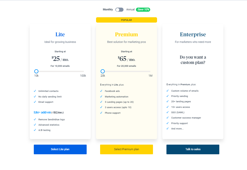 这个链接是Sendinblue的几个套餐选择, 对于群发邮件比较量大的话可以根据需求选择自己所需要的套餐,下面是一些简单的截图。