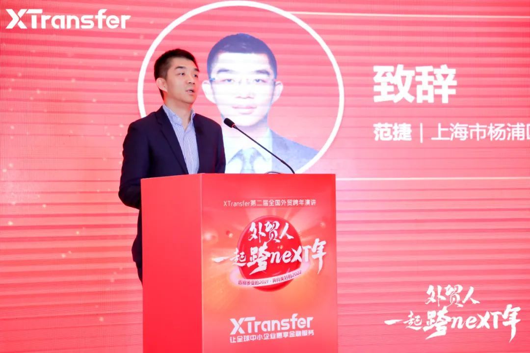 1月20日下午,XTransfer第二届全国外贸跨年演讲以"告别多变的2021,奔向美好的2022"为主题在上海成功举办,活动特邀上海市杨浦区商务委员会党组书记范捷致辞,杨浦区商务委员会副主任俞丹秋出席,经济学博士马红漫、2021XTransfer宝藏外贸人深圳分享赛总冠军胡靖以及XTransfer 创始人兼CEO邓国标发表精彩演讲。
