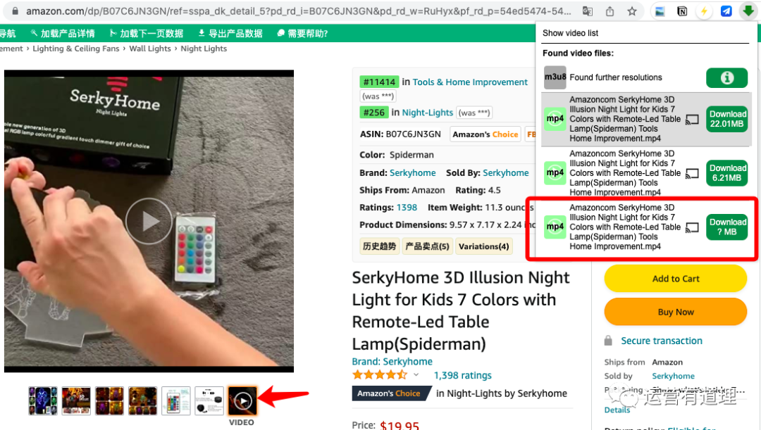 安装好工具,到亚马逊listing页,点击插件即可下载,如下图:会找出当前页面所有的视频,一般主图下的视频在查询结果的最下面(如下图红框),点击Download即可下载了
