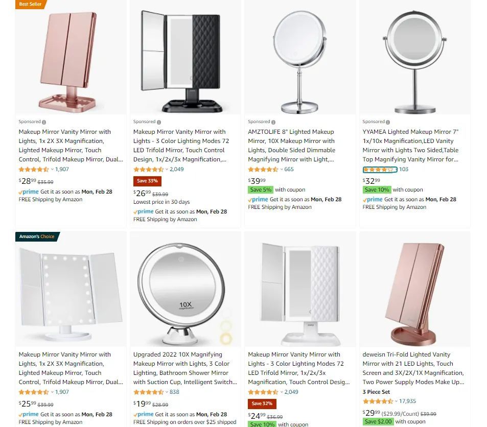 从首页商品风格来看,大多都是可灵活放置梳妆台面的支架款式,形状以圆形及折叠方形为主,最主要的特点具有倍数放大效果,带有USB充电,价格多以20-40美元不等,销量较高的这款留评量达17955条了。