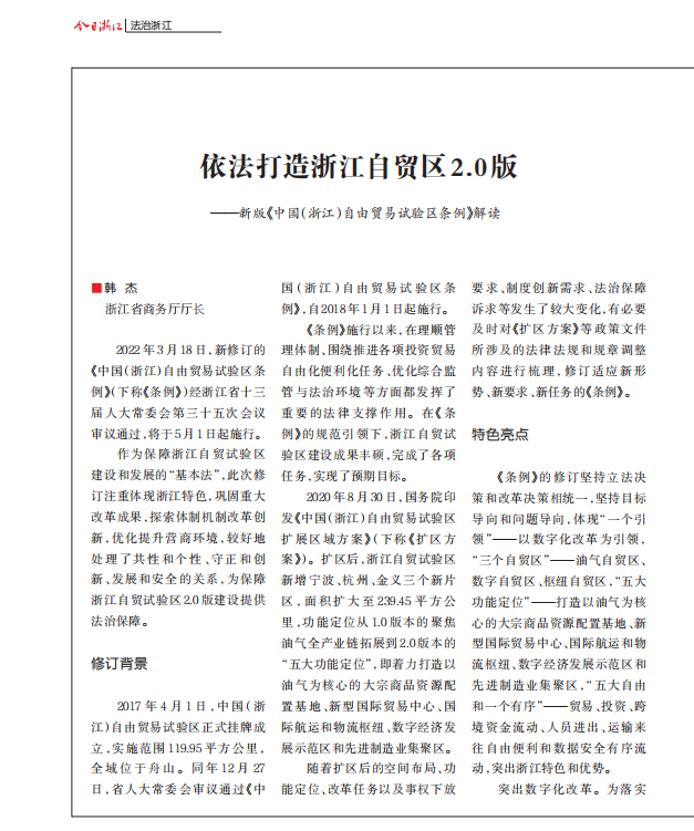 2022年4月,浙江省商务厅厅长、浙江省自贸办主任韩杰在《今日浙江》发表署名文章《依法打造浙江自贸区2.0版——新版〈中国(浙江)自由贸易试验区条例〉解读》。