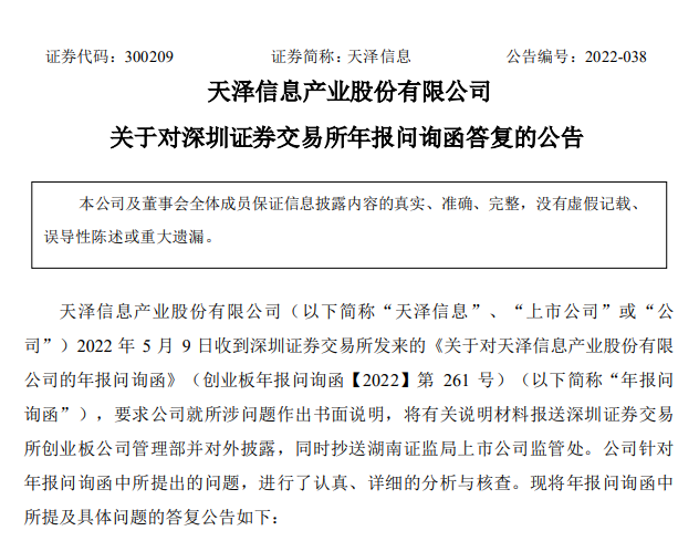 财报公布引来业界一片哗然,随之而来的,是深交所针对其所披露年报数据的一纸问询函。而这一纸问询函也在近日等来了天泽信息的答复公告。