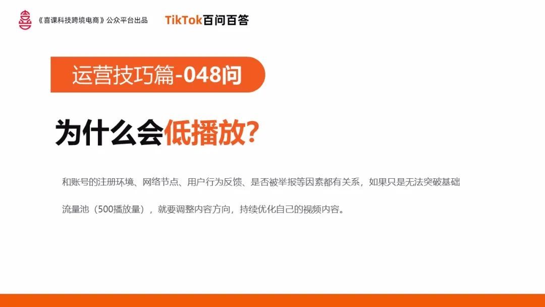 和账号的注册环境、网络节点、用户行为反馈、是否被举报等因素都有关系,如果只是无法突破基础流量池(500播放量),就要调整内容方向,持续优化自己的视频内容。