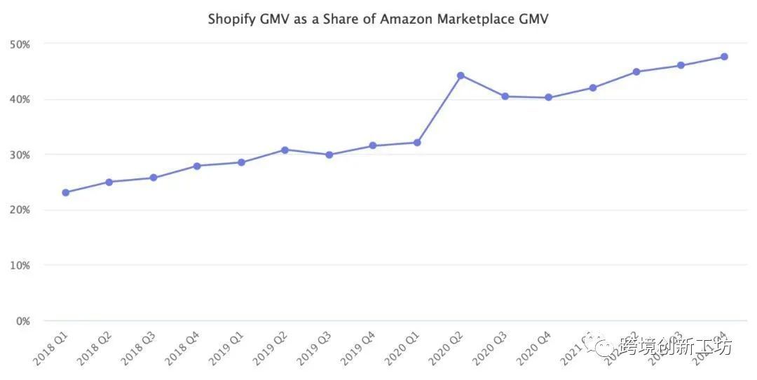 自2016年以来,Shopify作为亚马逊的首选"反叛军"(独立站VS平台)开始名声鹊起,进入发展快车道,年复合增长率高达60.98%,追赶亚马逊的脚步也开始逐渐加快。
