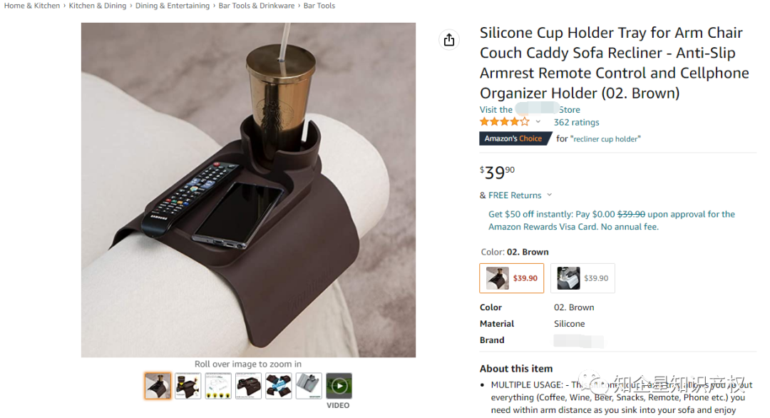 杜绝专利侵权风险,为您的产品保驾护航!今天分享一款硅胶沙发杯托,它是美亚站的Amazon'sChoice,售价39.9美金,留评363颗星。