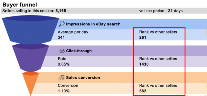 下面两幅图便是两个不同物品刊登的"listing quality report",左侧数据是卖家店铺中某一个类目的物品刊登在eBay平台上的曝光量、点击转化率和销售转化率,右侧红框中的是这些数据在同类卖家中所处的排名,排名越高说明在同类卖家中表现越好,也就可以优先选择进行广告投放。