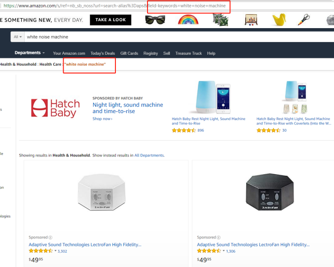 在常规搜索中,客户会在亚马逊搜索栏输入"white noise machine"。这将生成参数"field-keywords= white+noise+machine",并生成以下截图中的结果。