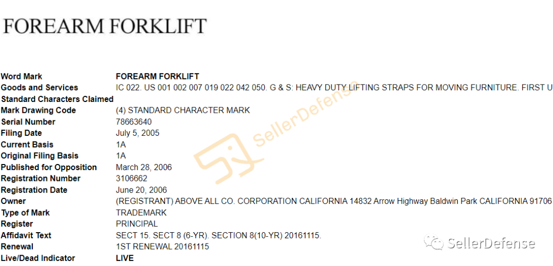 原告品牌:FOREARM FORKLIFT 前臂叉车起重带