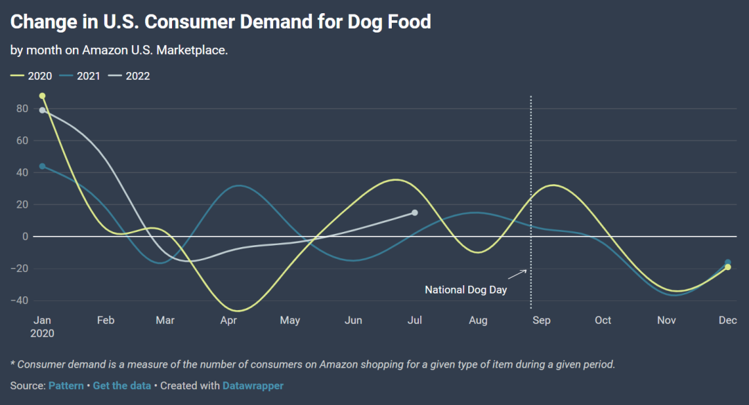 为了找出狗粮需求最高的时间,Pattern团队比较了 2020 年、2021 年和 20222 年每一天的每月亚马逊"狗粮"搜索查询,并发现了一些有趣的见解。最值得注意的是,消费者对狗粮的需求每年在1月达到顶峰,与2021年12月相比,2022年1月的需求增长了 79%。