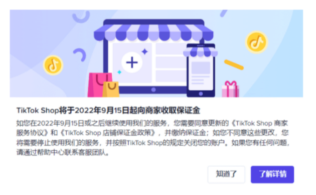 TikTok Shop公告称:如您在2022年9月15日或之后继续使用我们的服务,您需要同意更新《TikTok Shop 商家服务协议》和《TikTok Shop 店铺保证金政策》,并缴纳保证金;如您不同意这些更改,您将需要停止使用我们的服务,并按照TikTok Shop的规定关闭您的账户。