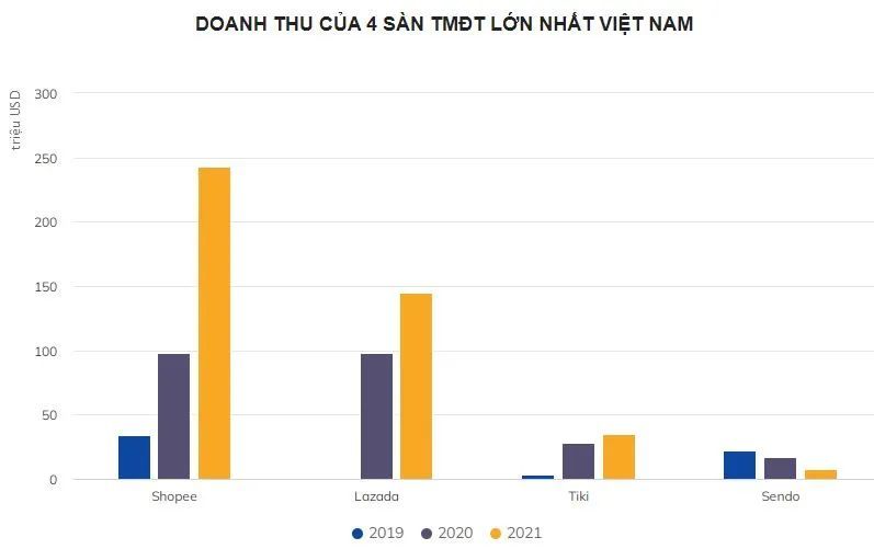 数据显示,在 2021 财年,Shopee Veitnam 的收入最高,为 2.432 亿美元,其次是 Lazada Veitnam,为 1.45 亿美元,之后是 Tiki(3500 万美元)和 Sendo(770 万美元)。