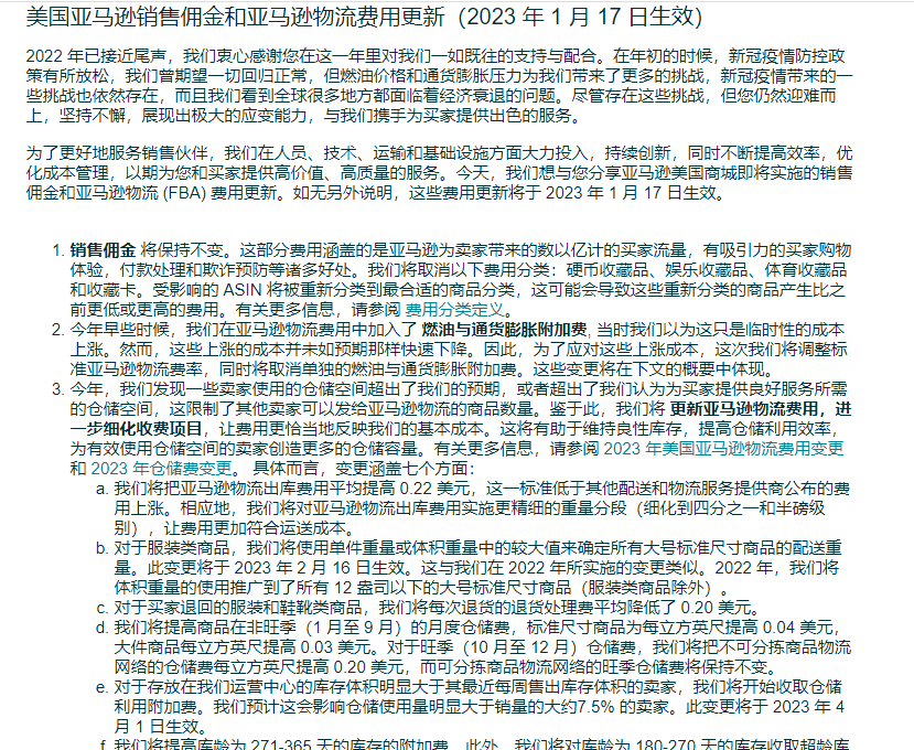 "今年,看到了卖家使用我们仓库,超出了我们的预期,导致很多其他卖家无法将产品发送到FBA,因此我们将FBA费用进行更新并创建更多细致的收费标准,以继续更好地使费用与我们的基础成本保持一致。
