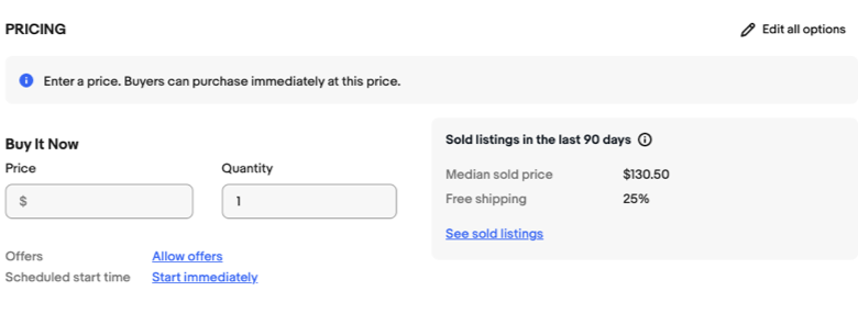 Price Guidance会根据您的物品标题及分类给出价格指导,自动提供过去90天在eBay上售出的物品刊登信息,包括物品刊登的平均售出价格以及该售出的物品刊登是否提供免运费等信息。
